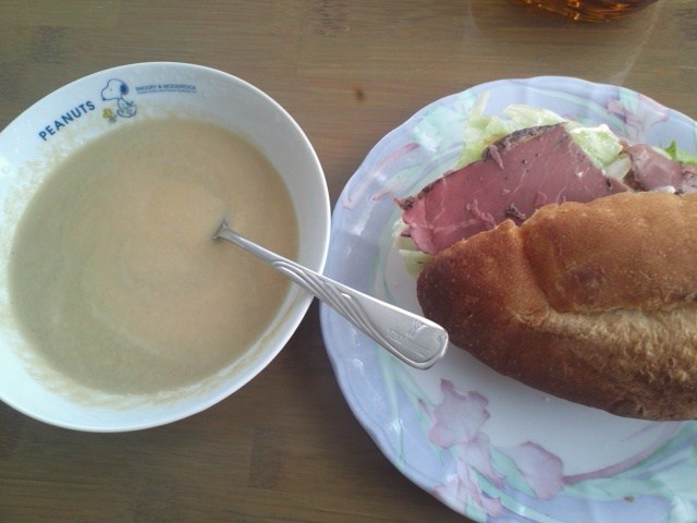 この日のお昼は「とりよせ上手」(現在はサービス終了)に入っていた【にしきやごぼうポタージュ】とマイブームのフランスパンのサンドイッチ。